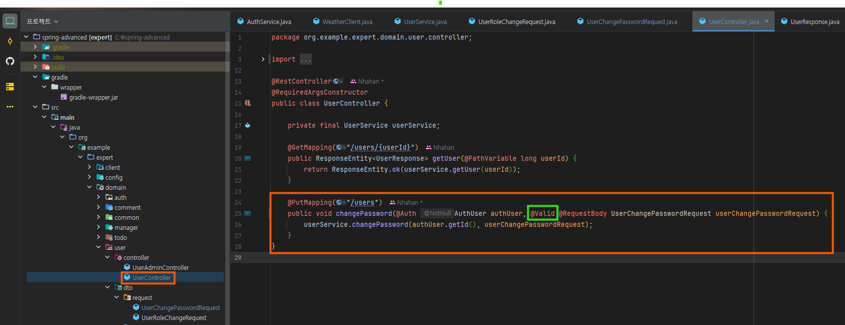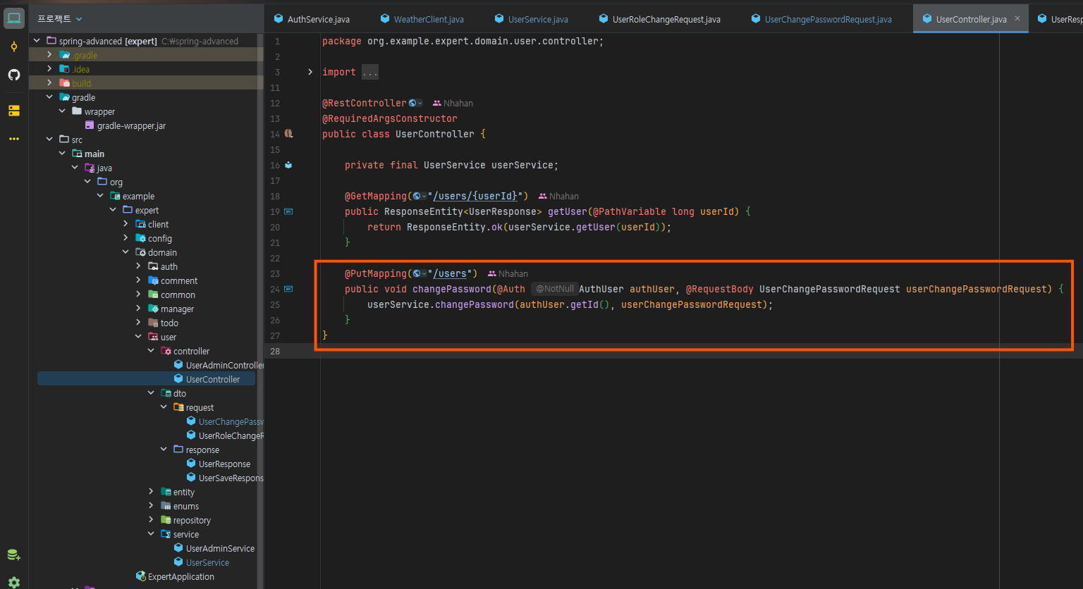 Resolver 목록에 AuthUserArgumentResolver를 등록해 주고 다시 확인해 보면 처음과 달리 흰색으로 바뀐 걸 확인할 수 있다!