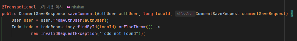 그렇기 때문에 todo.user에 null이 들어가면 NullPointerException(NPE)이 발생한다.