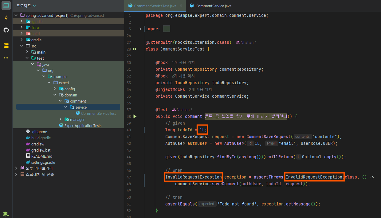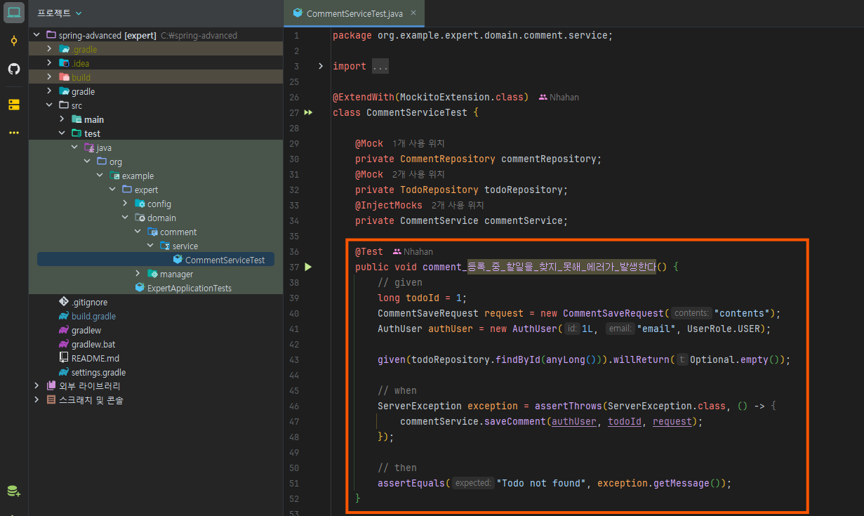 그러면 이 부분들을 서비스 로직에 맞춰 테스트 코드를 수정해 주겠다.