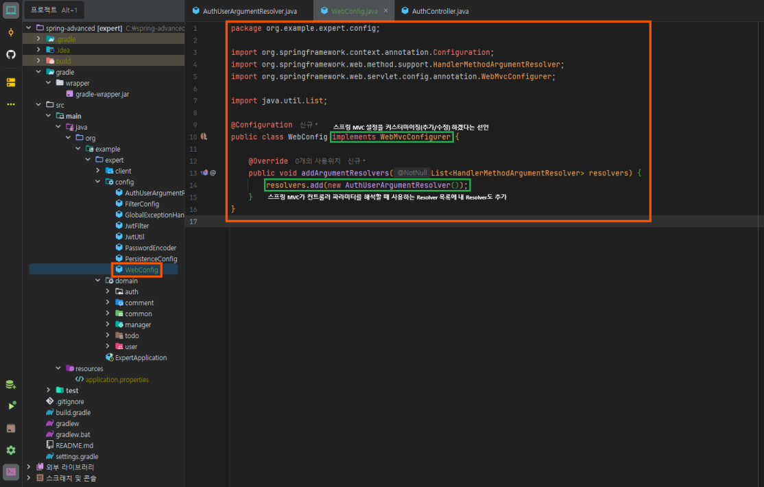 스프링 MVC 설정에 들어가서, 컨트롤러 파라미터를 해석하는 Resolver 목록에 AuthUserArgumentResolver를 추가 등록한다.