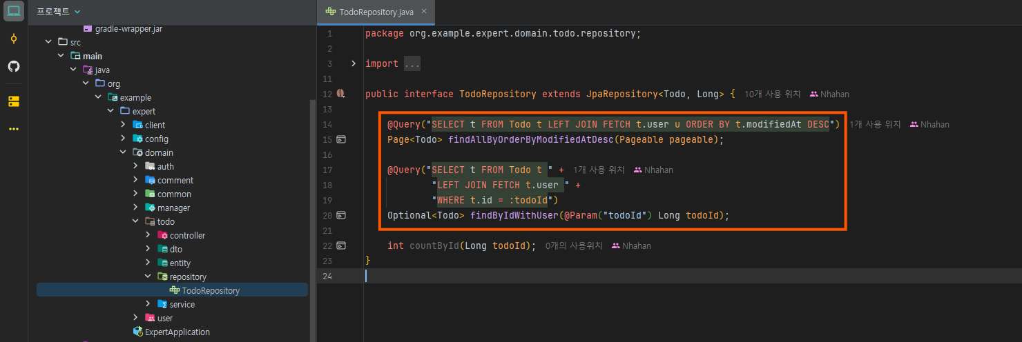 저 부분을 이제 @EntityGraph를 사용하여 바꿔주면 된다.