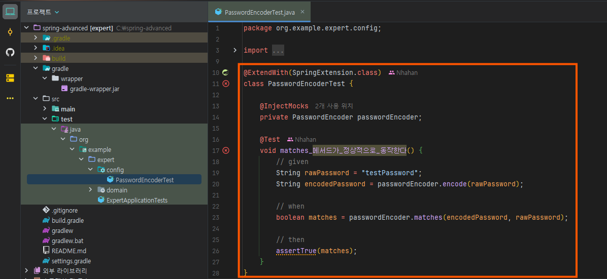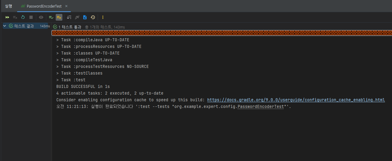이 테스트 코드는 비밀번호를 encode 하면 암호화되는지와matches로 비교하면 true가 나오는지를 검증하는 코드이다!