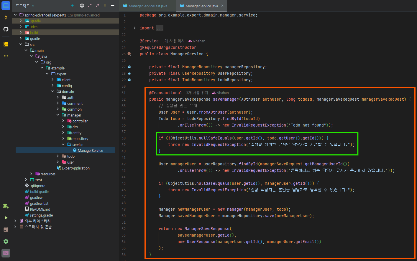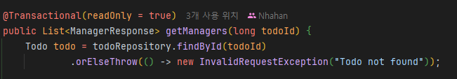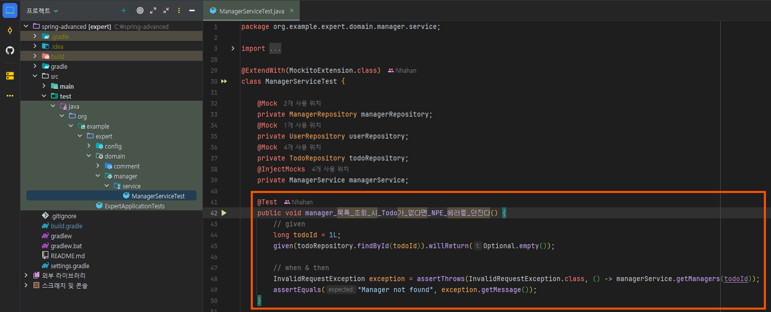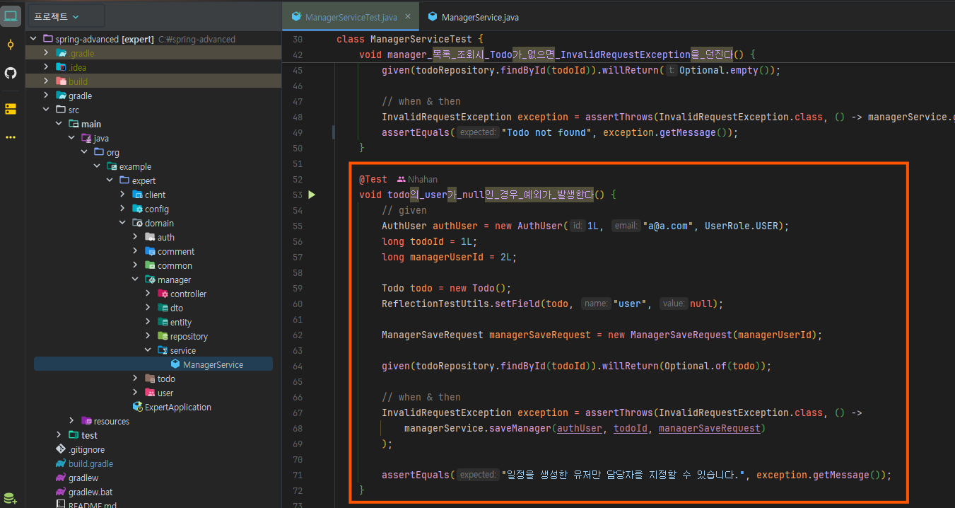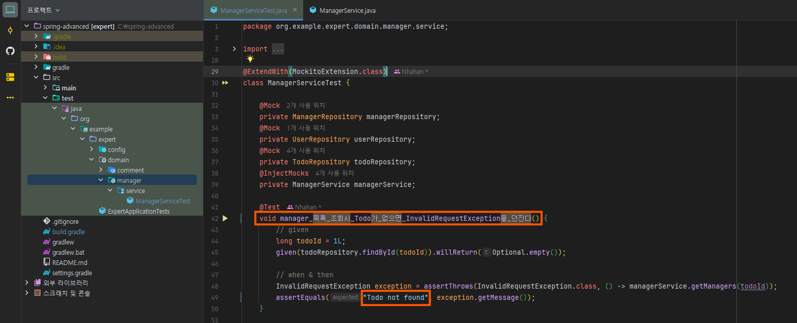 "Manager not found"가 아니라 "Todo not found"라는 점!