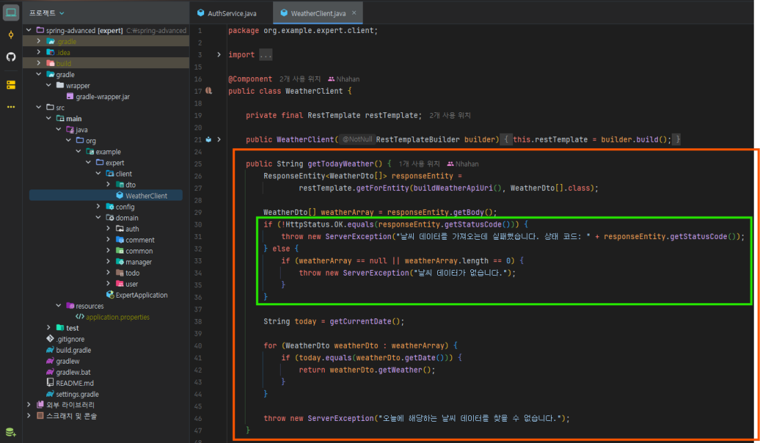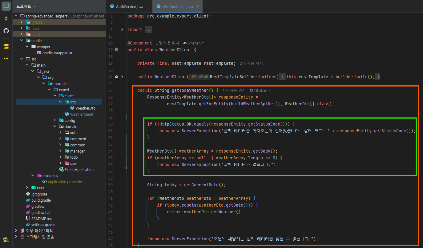 throw new ServerException("날씨 데이터를 가져오는데 실패했습니다. 상태 코드: " + responseEntity.getStatusCode());