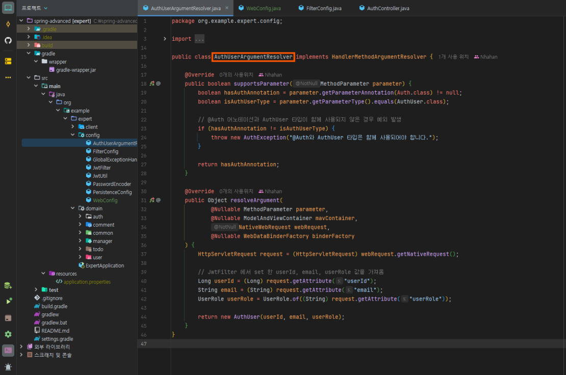패키지 org.example.expert.config; 에 위치한 AuthUserArgumentResolver의 로직이 현재 동작하지 않고 있습니다.