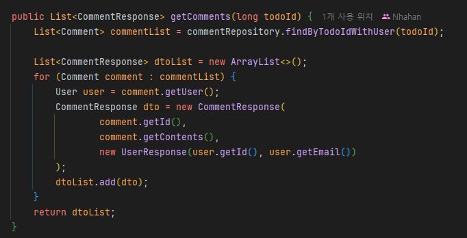 서비스 코드를 다시 보면 댓글을 조회할 때 댓글을 작성한 유저도 응답에 들어가는데,