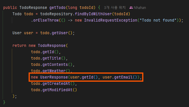 => 할 일 1개를 찾는데, 작성자 정보도 나중에 따로 찾지 말고 처음부터 같이 한 번에 가져와라