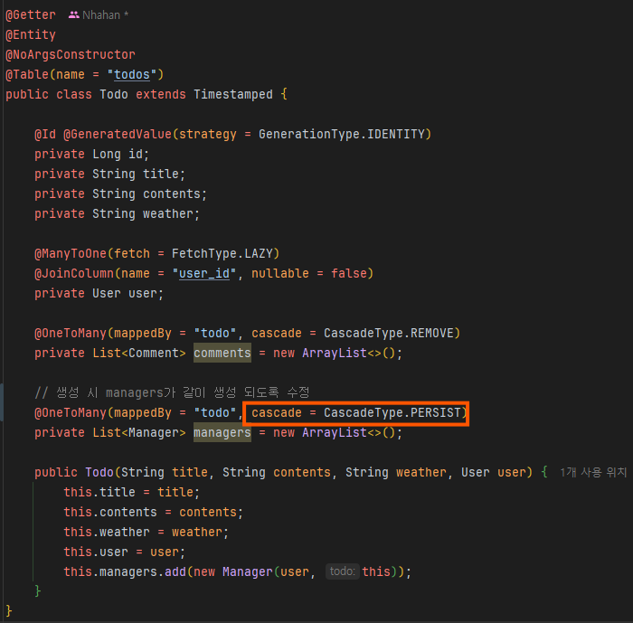 이 말은 즉 Todo 저장할 때 Manager도 같이 저장되도록 cascade만 추가해주면 된다는 것이다!