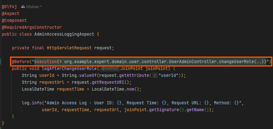 2. AdminAccessLoggingAspect 클래스에 있는 AOP가 개발 의도에 맞도록 코드를 수정